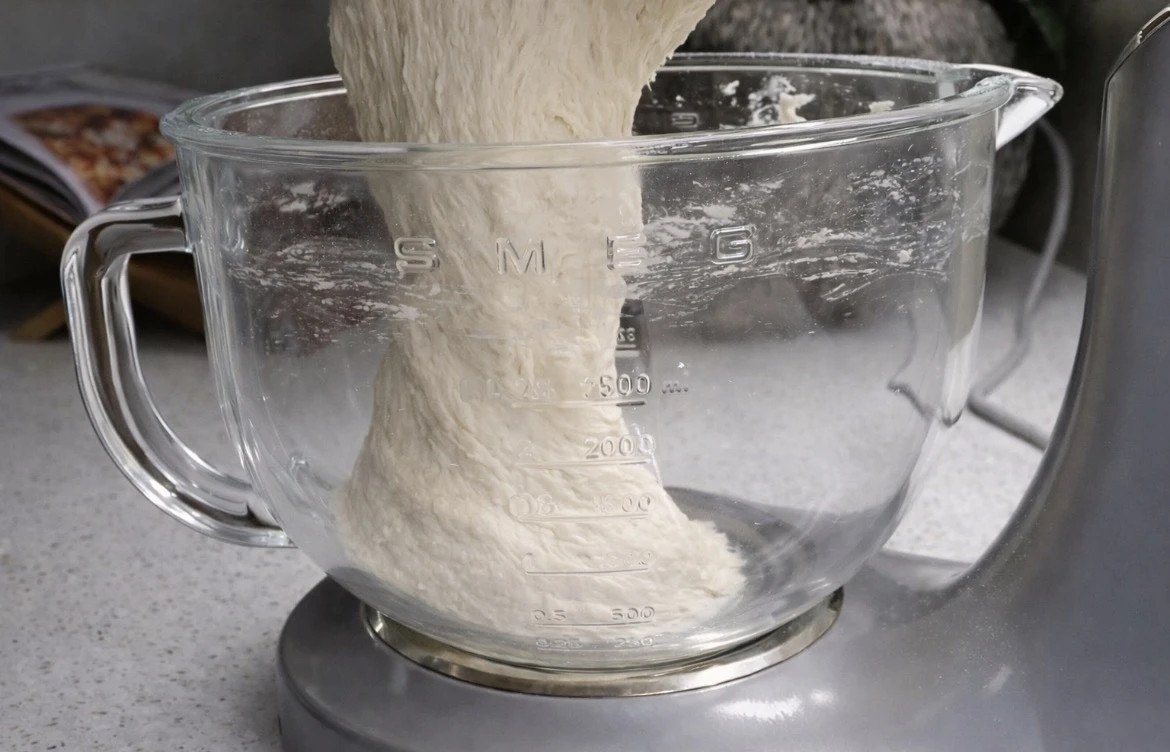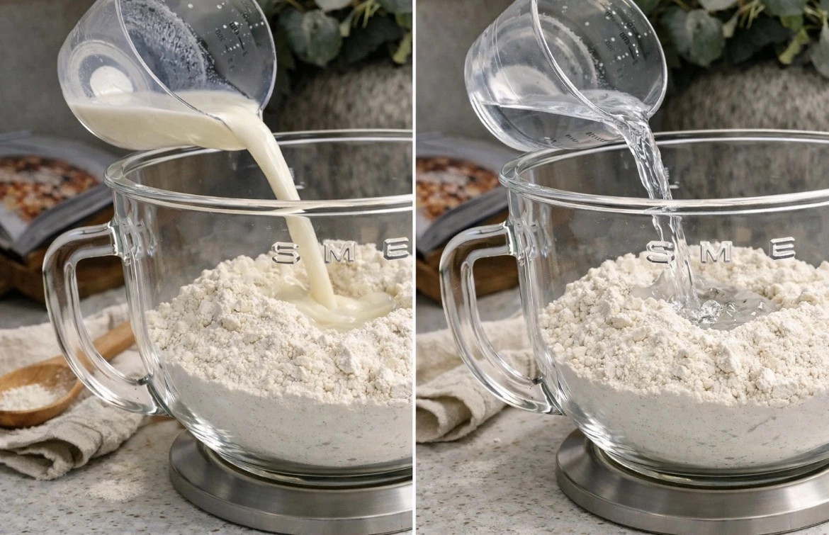 2. Shto qumështin dhe ujin e vakët në miell dhe përziej derisa të bëhet një brumë i butë dhe pak ngjitës që fillon të shkëputet nga ena.