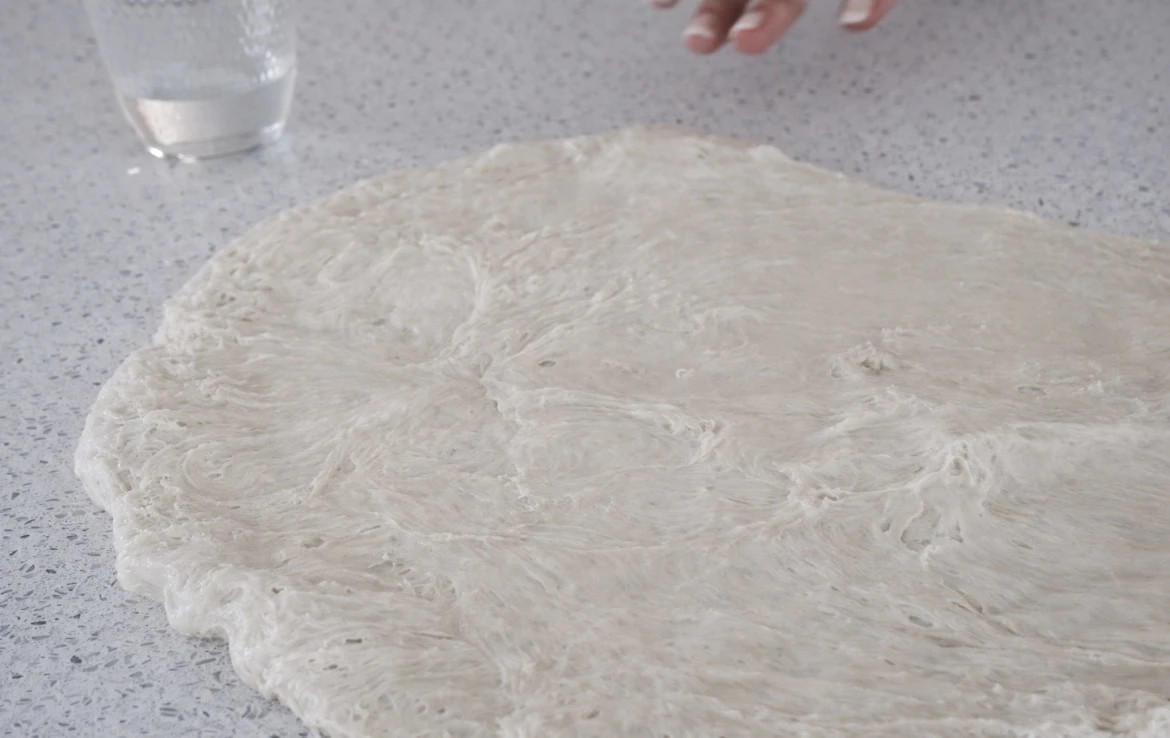 4. Vendose brumin në tavolinën e punës të lagur pak me ujë. Me duar të lagura hape lehtë në formë drejtkëndëshi. Lëre të pushojë rreth 15 minuta para se ta ndash në pjesë.