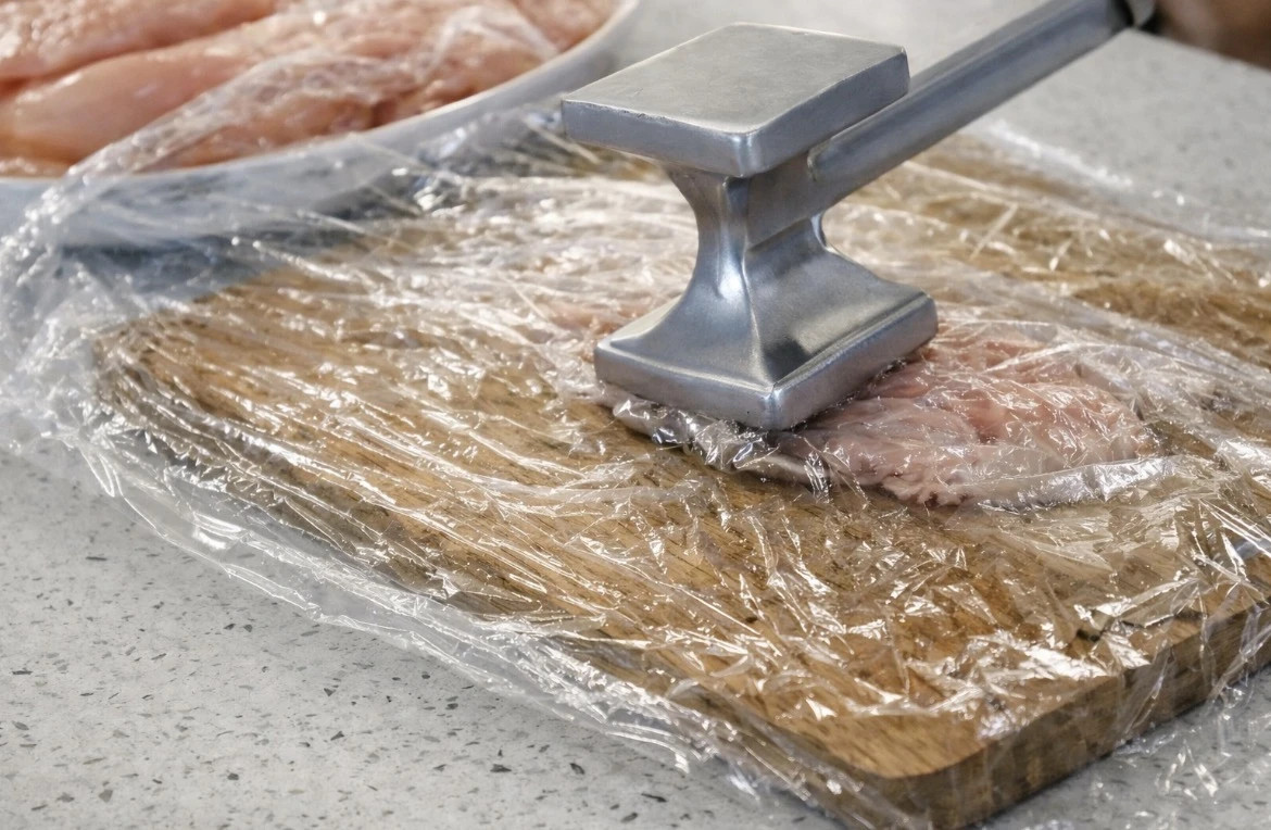Vendosi copat në një dërrasë kuzhine, mbuloji me një folie plastike dhe rrahi lehtë me çekiç mishi derisa të bëhen të njëtrajtshme.
