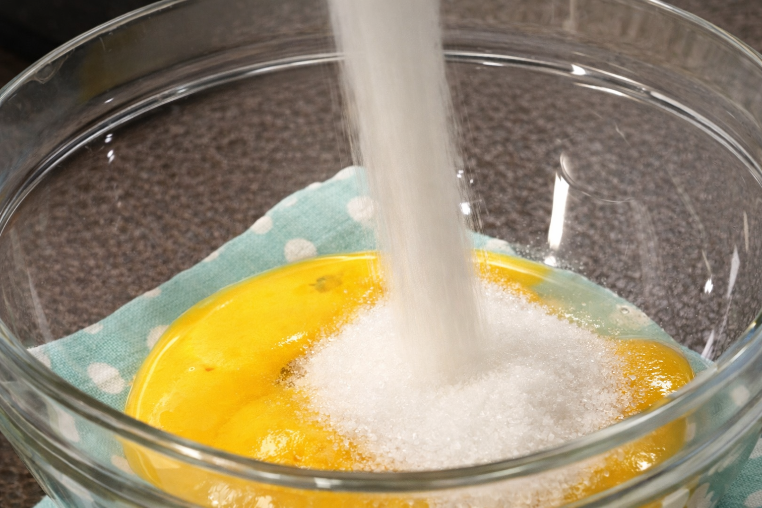 Në një tas, përziej të verdhat e vezëve me sheqerin derisa masa të bëhet homogjene.
