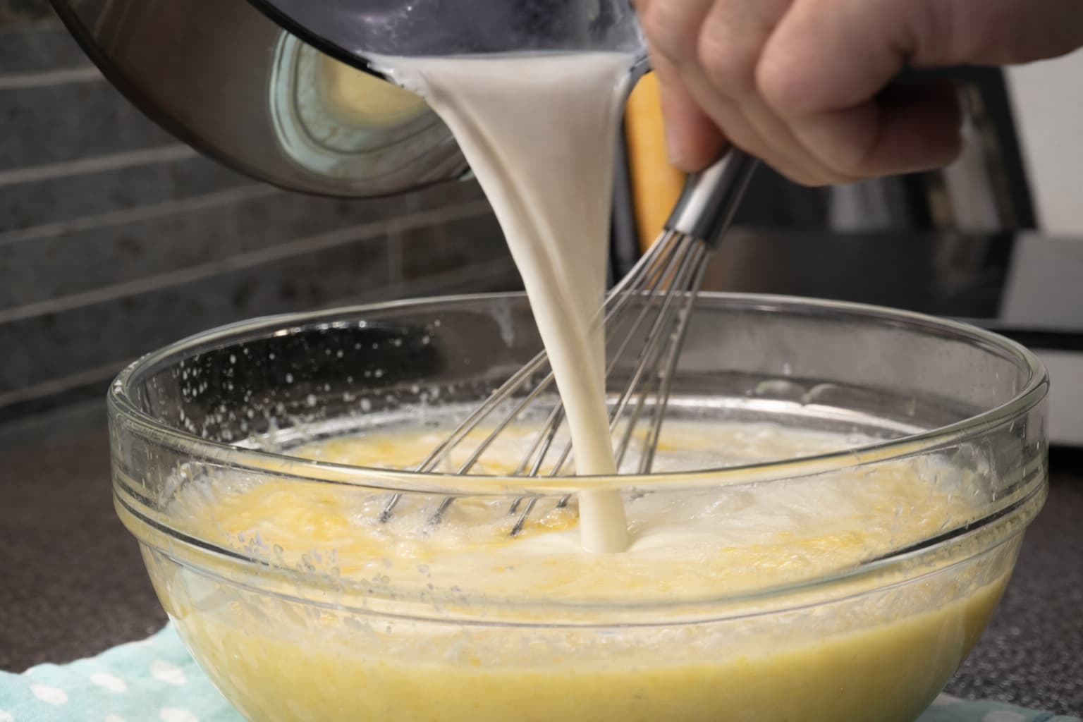 Hidhe qumështin e ngrohtë gradualisht te përzierja me vezë duke përzier vazhdimisht.