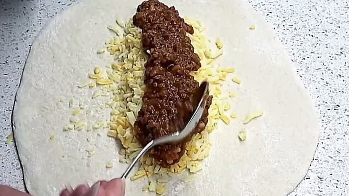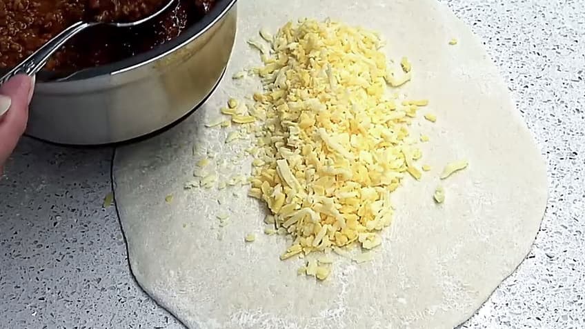 Vendos rreth 100 g djathë të grirë në mes të brumit.