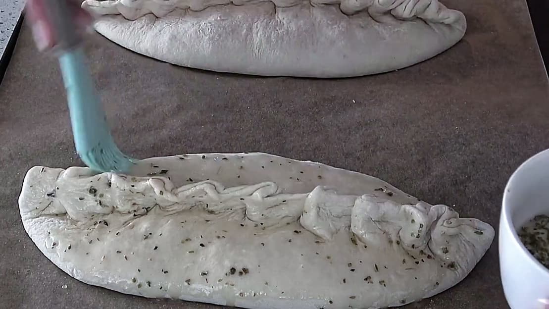 Përziej 3–4 lugë gjelle vaj ulliri me pak rigon dhe lyeji sipër calzone.