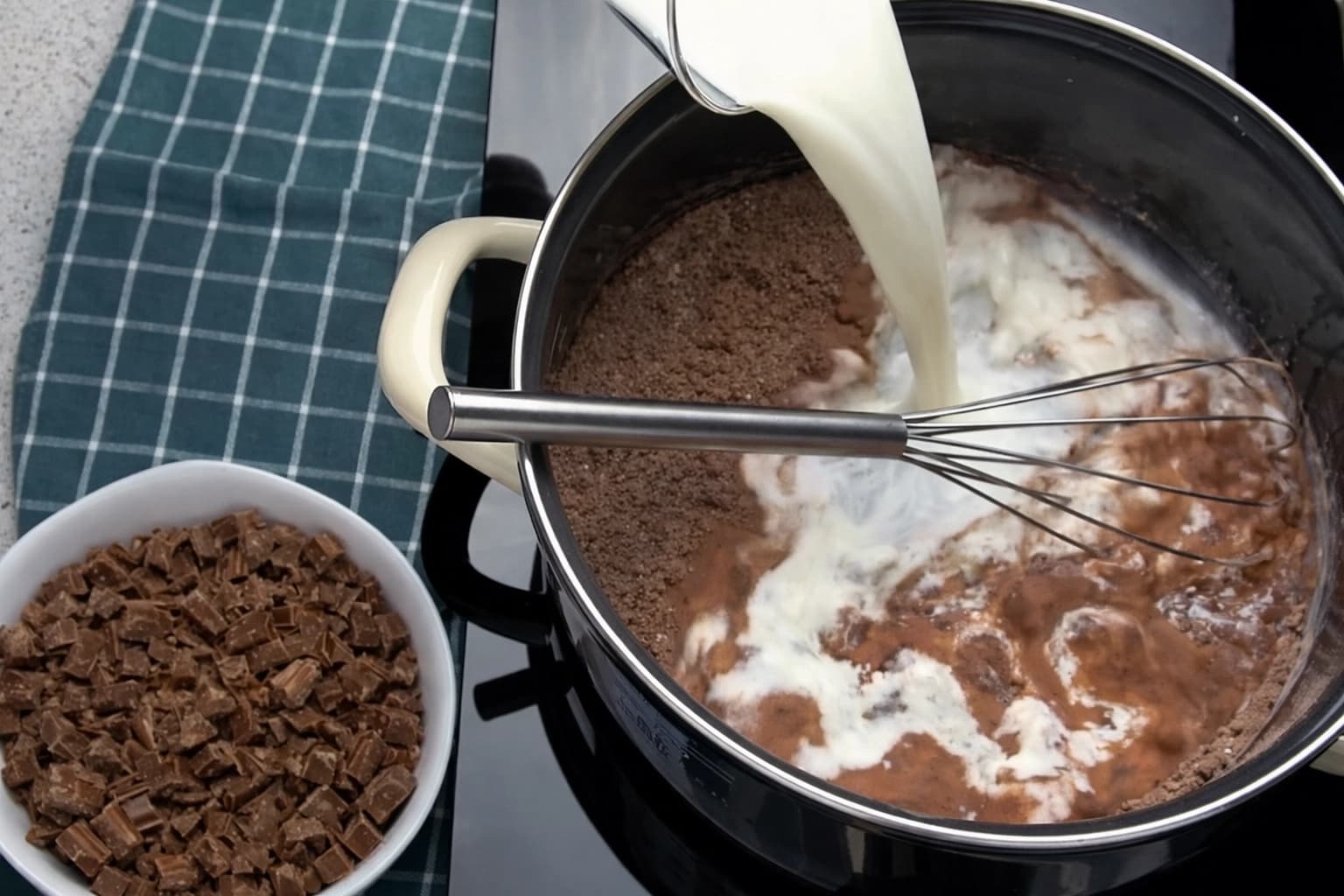 Në një tenxhere mesatare, shto miellin, kakaon, sheqerin vanilje, kripën, sheqerin dhe niseshten.