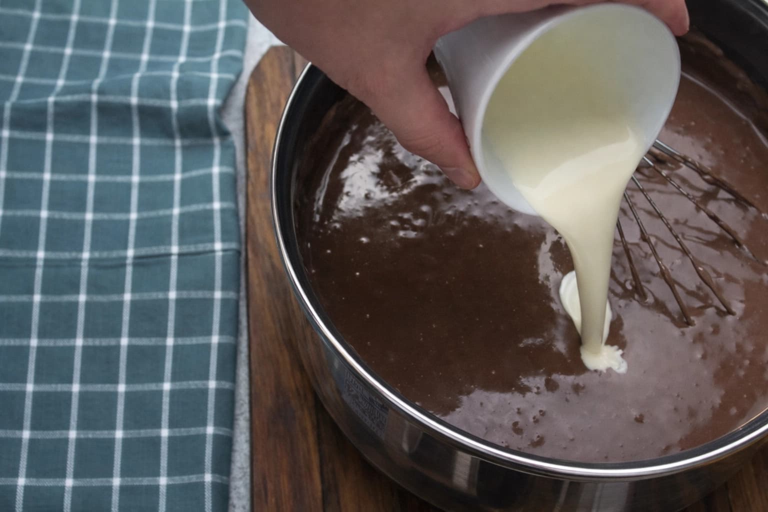 Hidh 80 ml krem pana dhe përzieje mirë derisa masa të bëhet e njëtrajtshme dhe kremoze.