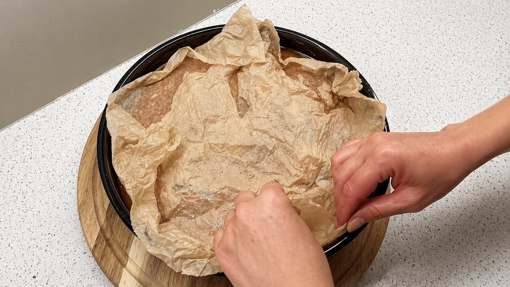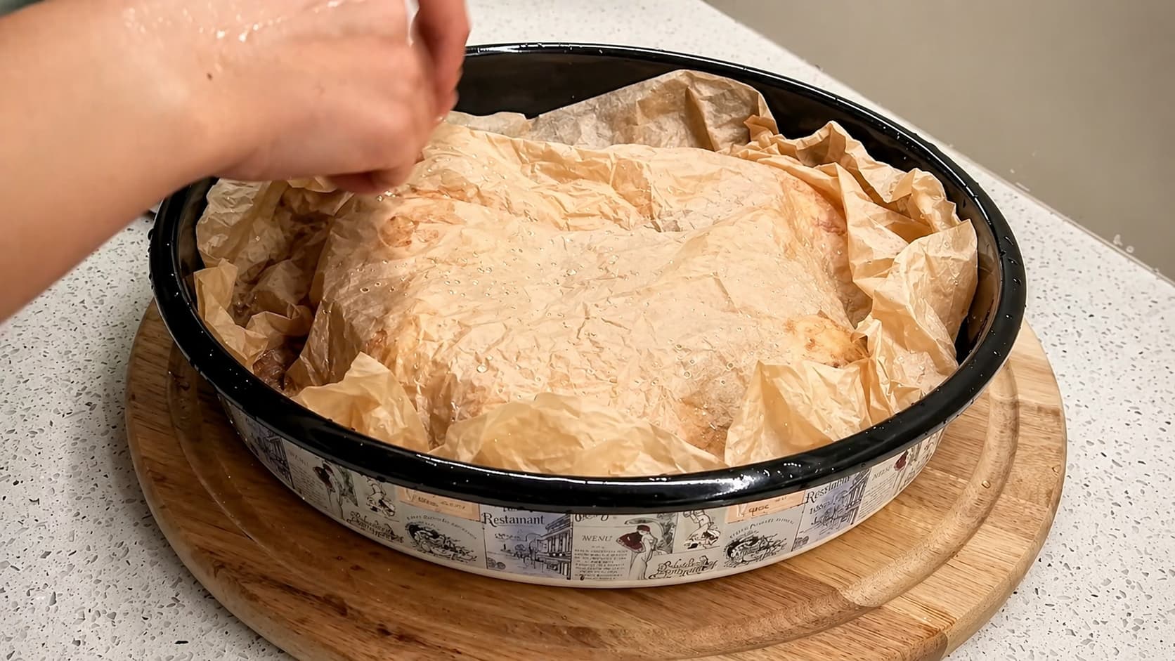 Lage një letër për pjekje me ujë, shtrydhe lehtë dhe mbulo pulën përpara se ta fusësh në furrë.