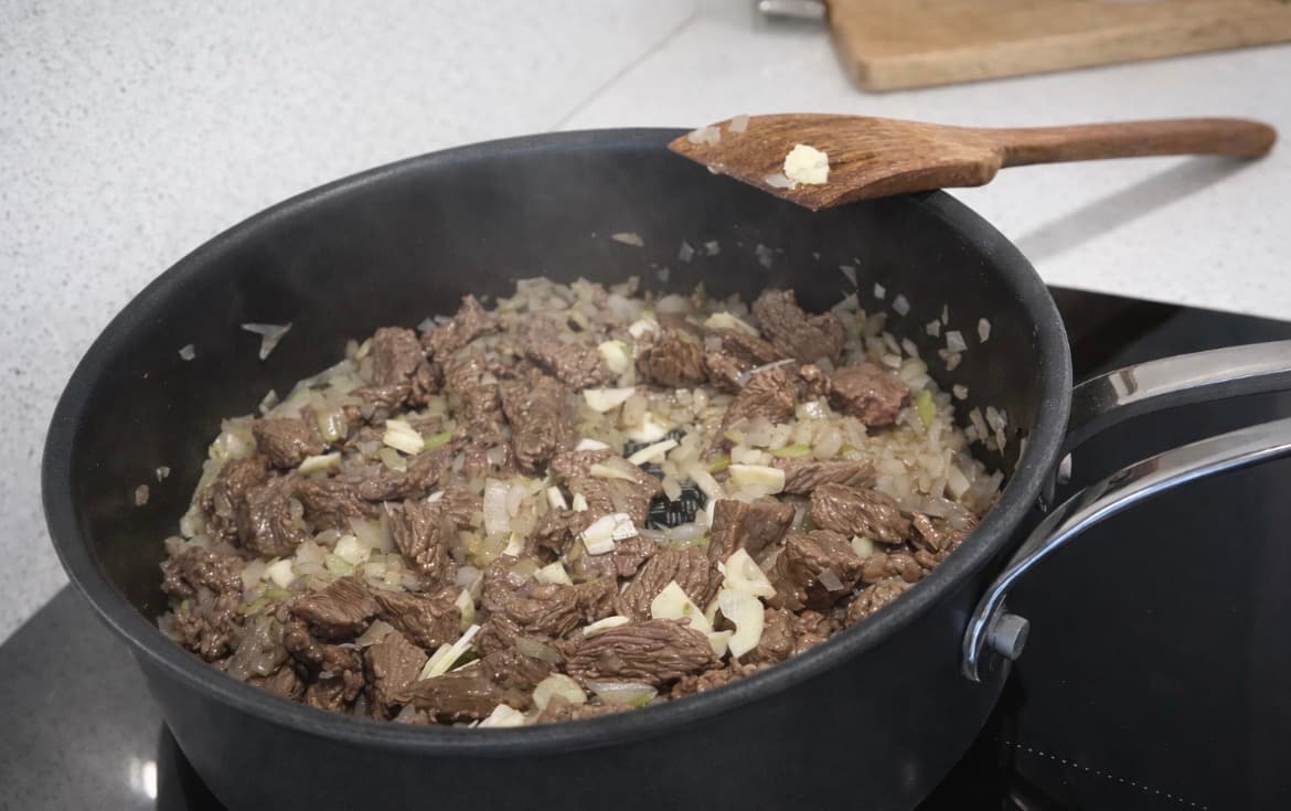 Në një tigan të thellë, ngroh 2 lugë gjelle vaj ulliri dhe skuq mishin e viçit derisa të marrë një ngjyrë të bukur kafe.