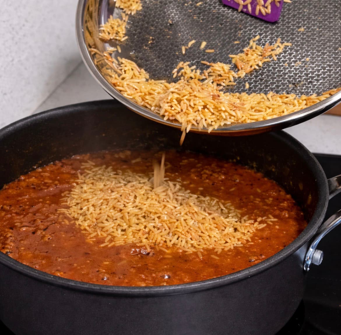 Pastaj shtoje orzon në salcën me mish. Shto edhe rreth 300 ml lëng perimesh dhe lëre të ziejë për 15 minuta me kapak. Nëse duhet, shto pak më shumë lëng.