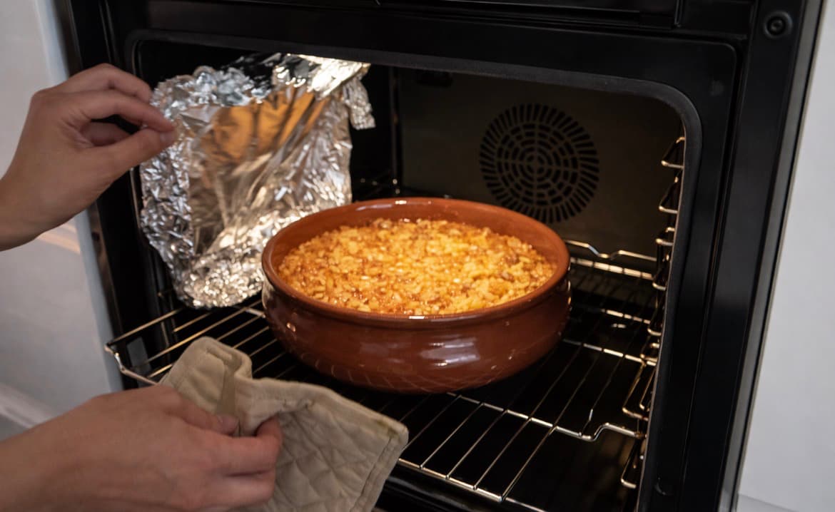 Kaloje masën në një tavë (tepsi) që futet në furrë. Mbuloje me letër alumini dhe piqe në 180°C për 15 minuta.