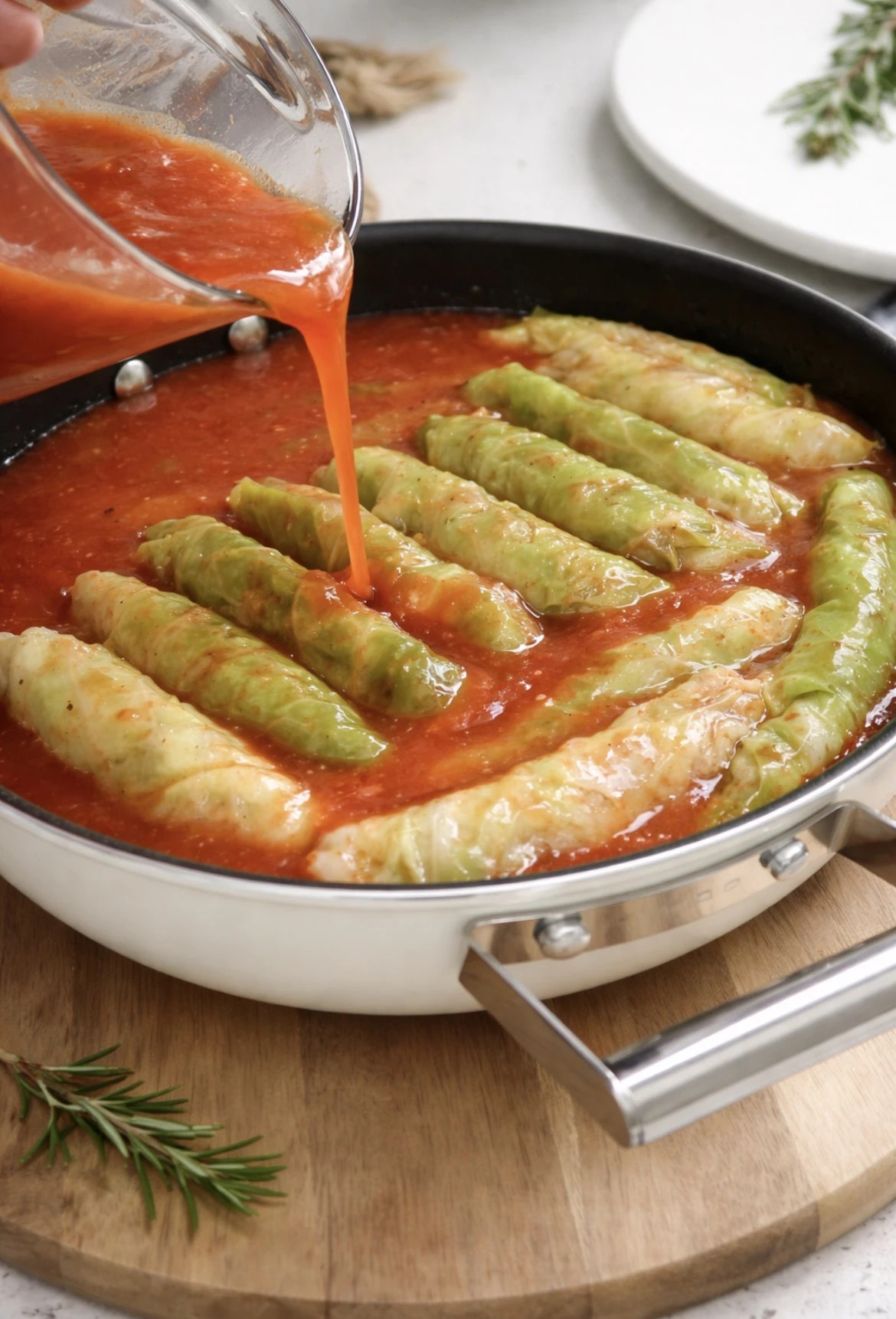 Pjesët e mbetura të lakrës (kërcelli dhe gjethet e vogla) prit në shirita dhe shtroji në fund të tenxheres – kjo jep më shumë shije dhe i mban sarmatë të qëndrueshme.