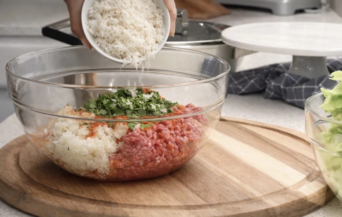 Shto mishin e grirë, qepën e grirë, kripën, piperin, specën pluhur, majdanozin, orizin dhe 100 ml ujë në një tas të madh.