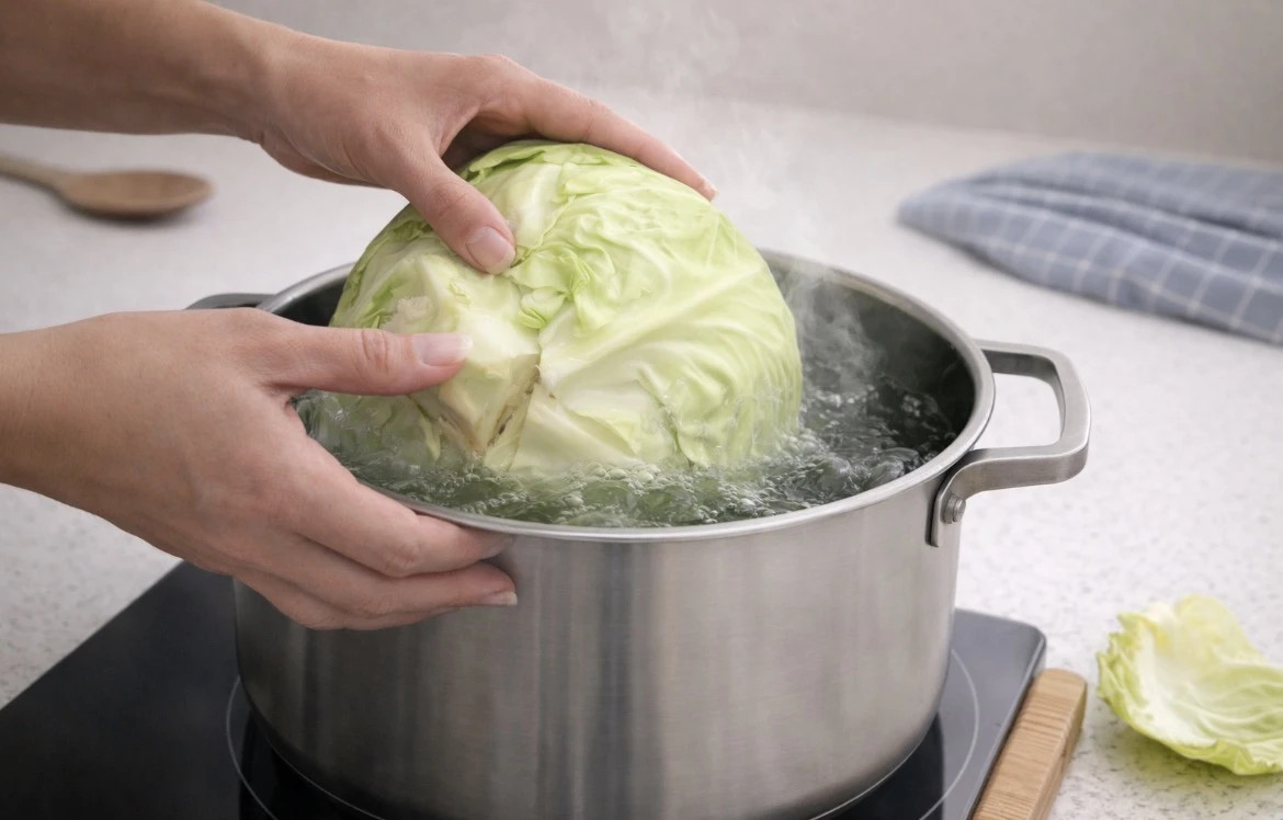 Në një tenxhere të madhe ziej ujin me kripë dhe lëre të vlojë. Pastaj ule temperaturën dhe vendose lakrën në ujë.